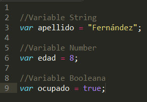 indicando su valor inicial, nombre y el tipo de dato al que pertenece.