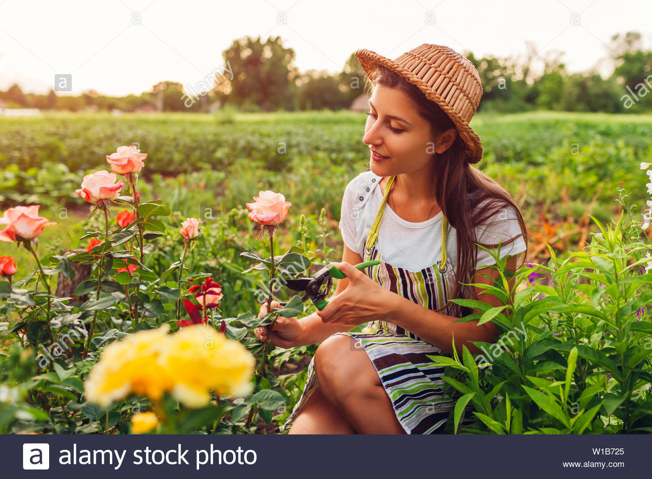 Mujer Joven Recoger Flores En El Jardin Jardinero Cortando Y Admirar Las Rosas Concepto De Jardineria Estilo De Vida W1b725 (image/jpeg)