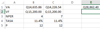 ¿De cuánto fue un prestamo que se liquidó con 2 pagos de Q15,200 c/u a 4 y 7 meses de plazo con intereses del 11.4% mensual capitalizable por meses