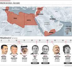 Tunísia: Ben Ali ( 23 anos); Egito: Hosni Mubarak (30 anos) e Líbia: Muammar Kaddafi (42 anos)