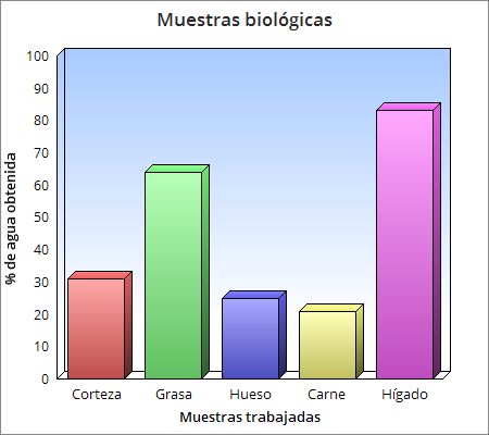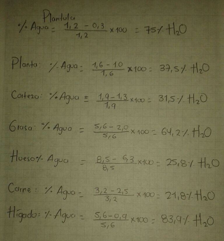 Peso fresco: 3,2 Peso seco: 2,5 % de agua: 21,8