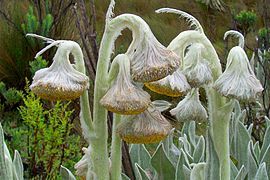 1. Las plantas de los páramos presentan una serie de adaptaciones que les permiten sobrevivir en un ambiente bastante hostil. Muchas tienen pelos que guardan el calor y hojas duras que evitan que se pierda agua por evapotranspiración. En general son especímenes achaparrados para protegerse del frío y el viento, aunque los frailejones (Espeletia y géneros afines) y las achupallas (Puya), a más de algunas especies de árboles, pueden alcanzar varios metros de alto. En algunos casos las adaptaciones pueden ser muy sofisticadas; en otros están prácticamente ausentes y estas especies deben aprovechar los microclimas generados por el resto de la vegetación.