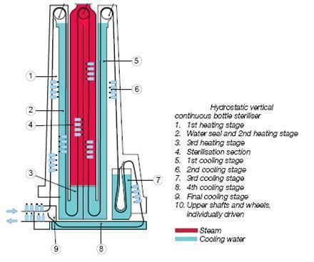 Autoclave vertical que transporta el envase por las diferentes columnas con las fases de esterilizacion