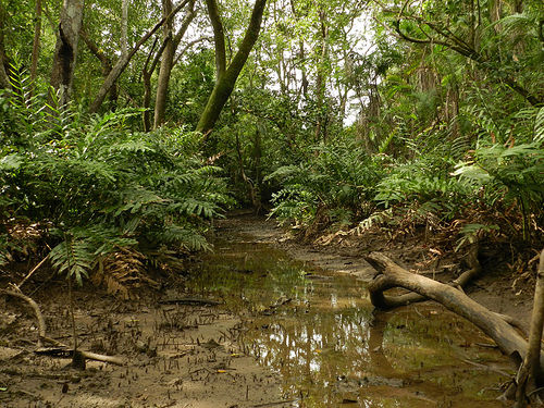 cercana a las desembocaduras de cursos de agua dulce de las costas de latitudes tropicales de la