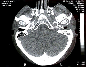 Erosión del hueso cortical y anormalidades de los tejidos blandos hasta el hueso temporal y a lo largo de la base del cráneo.