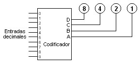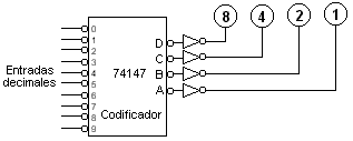 El codificador tiene diez entradas a la izquierda y cuatro salidas a la derecha, además puede tener