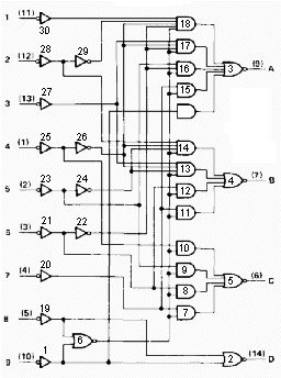 diagrama lógico del codificador 74147, donde se presentan las 30 puertas lógicas que lo conforman.