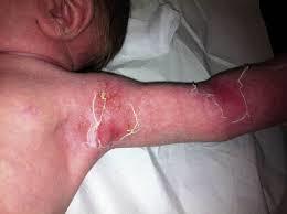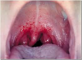 MC: Inica como un cuadro de faringoamigdalitis que al inicio tiene el aspecto de una quemadura solar con pequeños puntos elevedos que producen prurito, en 1 a 2 dias evoluciona a un exantema eritematoso puntiforme que inicia en sitios de flexion, cuello y cara, y despues se generaliza, suele respetar areas periorificiales, palmas y plantas. Tambien afecta la lengua al cubrirla con un exudado blanco amarillento que posterioremente se descama y revele una superficie roja llamada "lengua afranbuesada". Se acompaña de adenomegalias cervicales, escalofrios, fiebre >38.5°C, artralgias, nausea, vomito, hiporexia, faringitis. Se pueden encontrar maculas puntiformes rojas en la uvula y en el paladar duro y blando llamadas "Manchas de Forcheimer". La ruptura de los capilares hace aparecer lineas de color rojo (Lineas de Pastia) en los pliegues del brazo y de la ingle. y finaliza con descamacion en colgajos.
