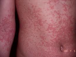 Roseola infantil, erupción eritematosa general, color rosado. Se presenta en menores de 2 años.