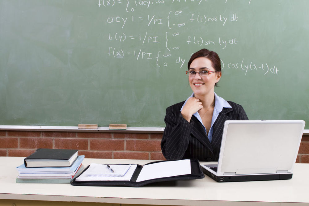 Profesora En Una Clase Con Un Laptop Y Libros (image/jpeg)
