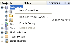 Window/Services en Netbeans, y selecciona "nueva conexión".