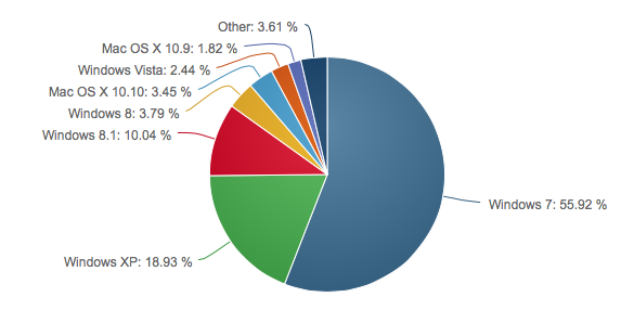 windows 7=55.92% windows xp=18.93% windows 8.1=10.4% Mac os x 10.10=3.45%