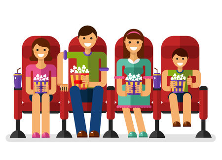 55349905 Ilustración De Estilo Plano De La Familia Feliz En El Cine Con Palomitas Y Refresco Viendo La Pelícu (image/jpeg)