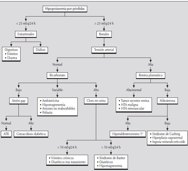 Pruebas complementarias El diagnóstico de la hipopotasemia se realiza con una completa historia