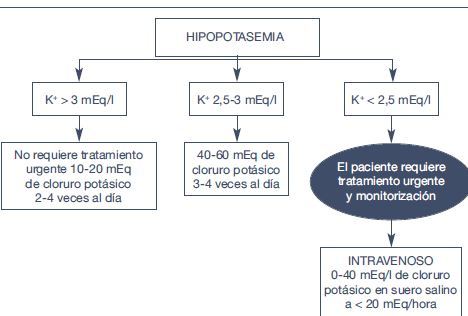 Oral: 429–K+ > 3 mEq/l, asintomático: 10-20 mEq K+ de cloruro potásico 2-4 veces al día (2080