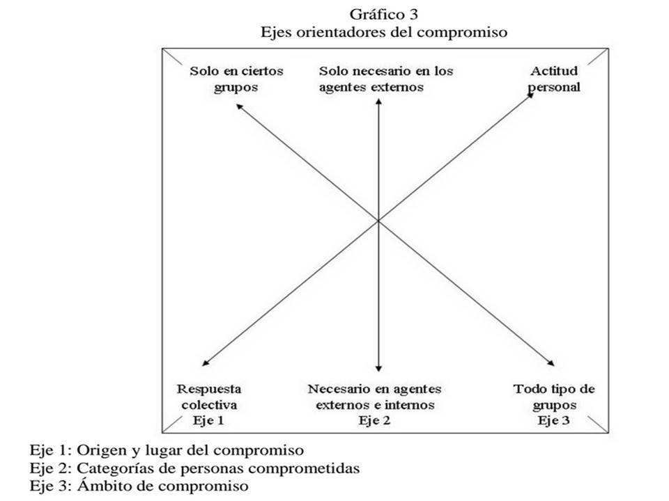 de los agentes externos a los agentes internos, según dónde se asiente el compromiso. Lo que estos ejes señalan es que el compromiso no es un fenómeno uniforme, sino que puede oscilar a lo largo de esos tres ejes