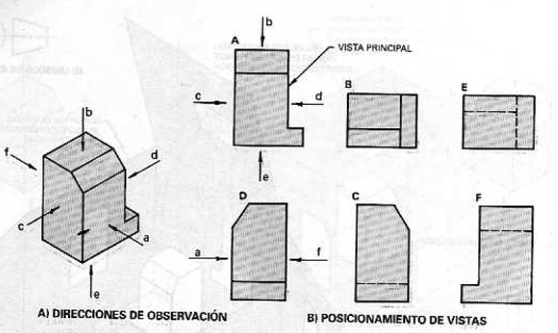 Proyeccion de tercer angulo, de primer angulo, plantillas de flechas de referencia y representacion ortografica reflejada