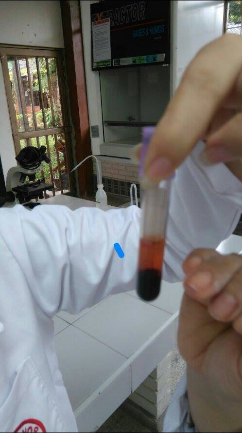 la muestra se lleva a la centrifugadora por 15 minutos. después se saca y en ella observamos 3 capas, la primer capa es plasma, la segunda son los globulos blancos y la ultima es elictrositos