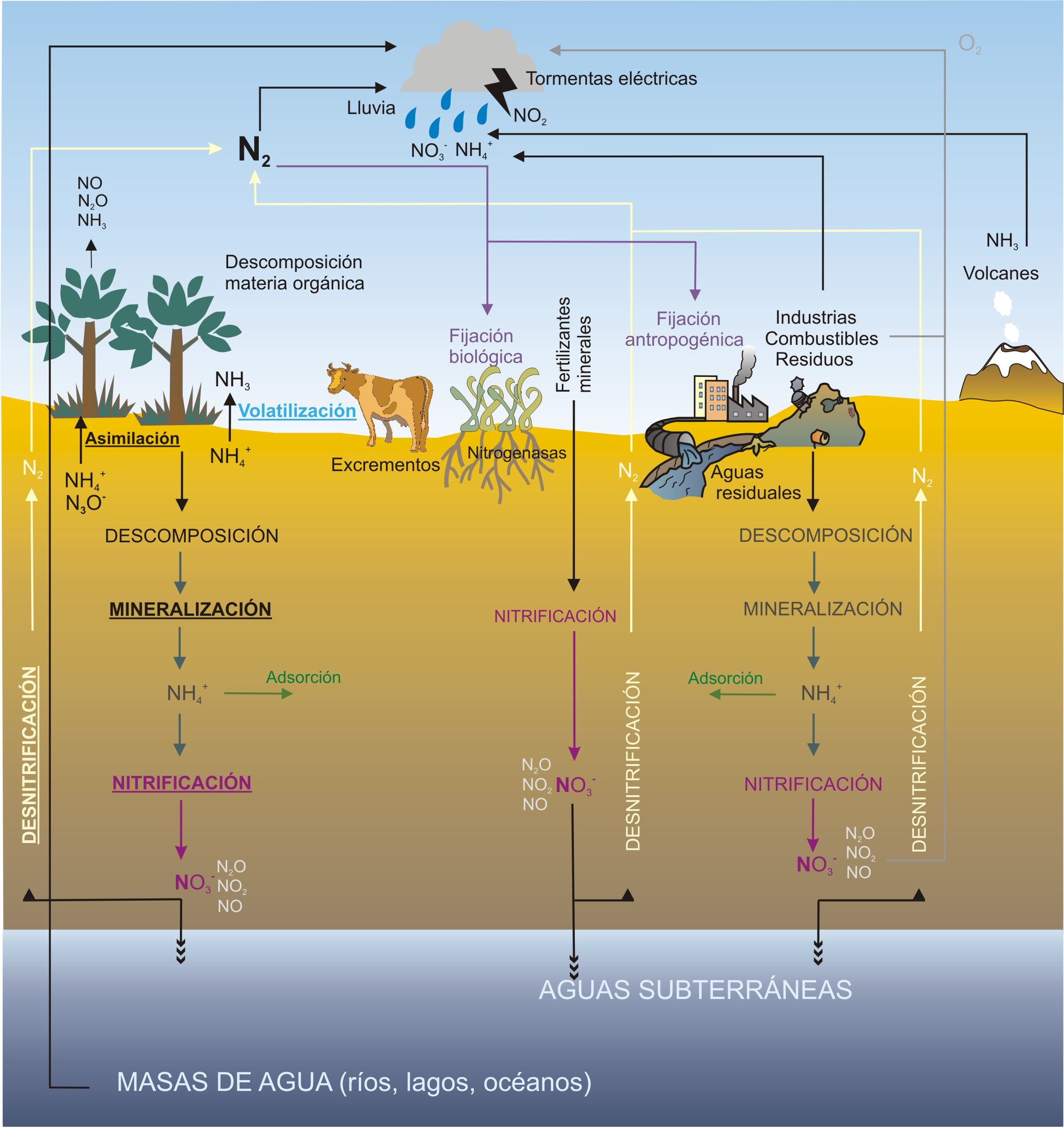 2. Nitrificación: Es la oxidación de ammonia a nitrito (NO2-) y luego a nitrato (NO3-), una forma