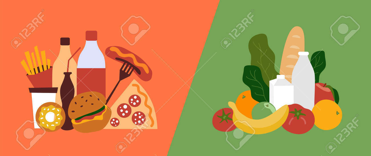 173419010 Comida Rápida Poco Saludable Vs Nutrición Saludable Buena Y Mala Elección De Productos Mala Comida (image/jpeg)