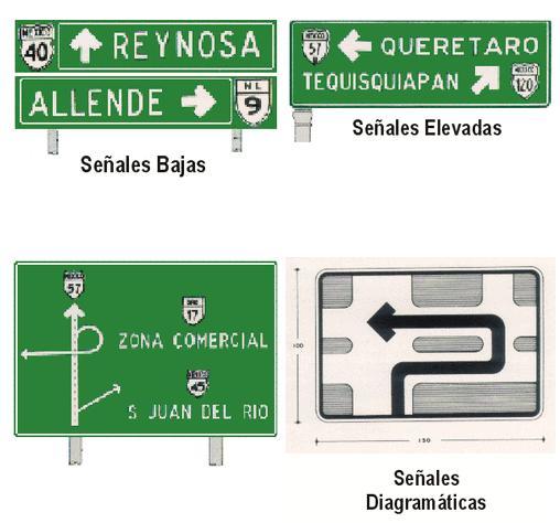 Son de fondo verde, orlas, flechas y textos en blanco, con excepcion de las señales