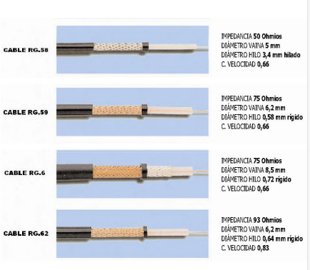 1. RG-58/U: núcleo de cobre sólido. RG-58 A/U: núcleo de hilos trenzados. RG-59: transmisión en banda ancha (CATV). RG-6: mayor diámetro que el RG-59 y considerado para frecuencias más altas que este, pero también utilizado para transmisiones de banda ancha. RG-62: redes ARCnet.