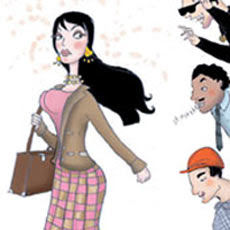 TRAS EL TERMINO DEL CONGRESO INTERNACIONAL DE LINGÜISTICA. UNA MUJER ES ACOSADA POR LINGUÍSTAS, FILÓSOFOS,