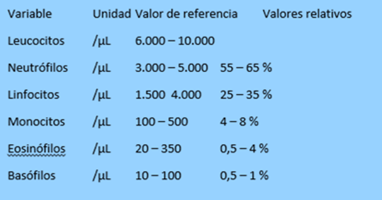WBC (white blood cell) 4.500 a 10.000 células / mcl