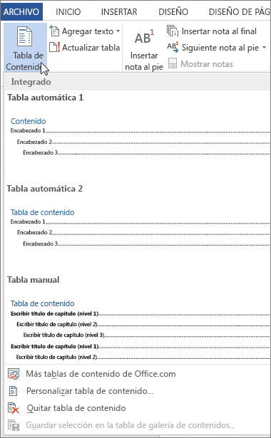 Haga clic en Referencias > Tabla de contenido y, a continuación, elija una Tabla automática de la galería de estilos