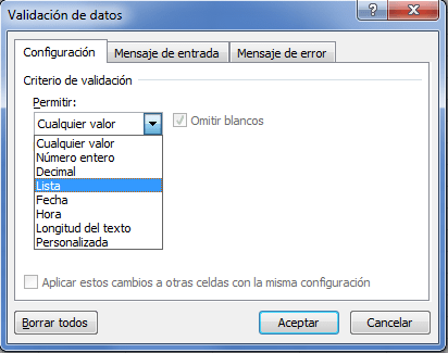 Se usa para controlar el tipo de datos o los valores que los usuarios pueden escribir en una celda.
