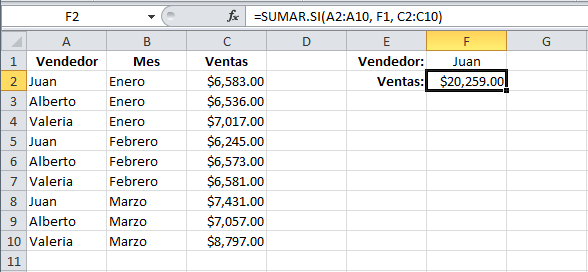 sirve para sumar los valores de un intervalo que cumplen los criterios especificados. Por ejemplo, si tenemos una columna que contiene números y queremos sumar solamente los valores que sean superiores a 5, usaremos esta fórmula: =SUMAR.SI(B2:B25,">5")