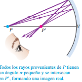 a) Un espejo esférico cóncavo forma una imagen real de un objeto puntual P que