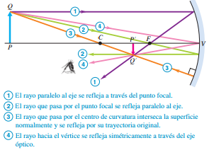superficie) está en C, y el vértice del espejo (el centro de la superficie del espejo) está en V. La