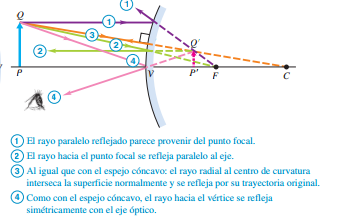 1. Un rayo paralelo al eje, después de reflejarse, pasa por el punto focal F de un espejo cóncavo o parece