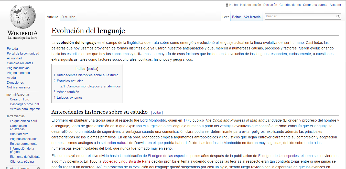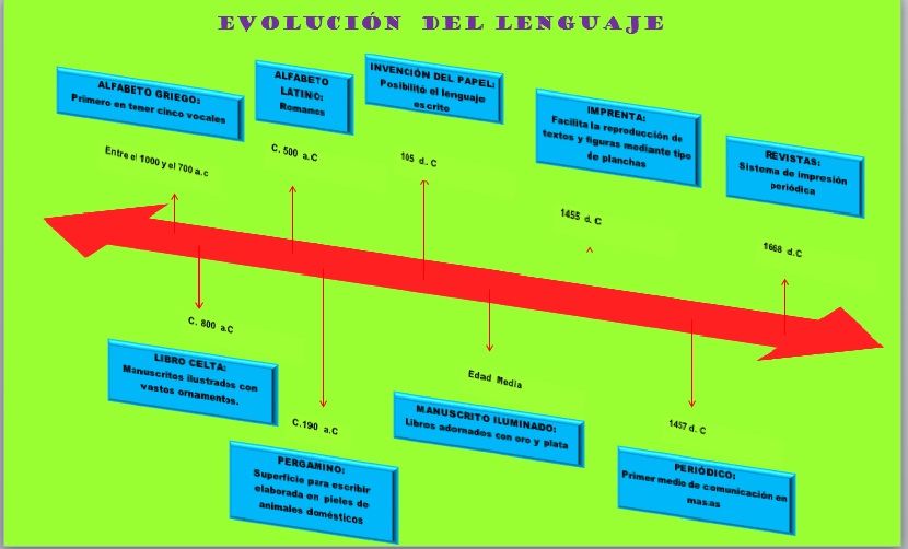 En un primer momento encontrarás una línea de tiempo que grosso modo destaca momentos importantes en el proceso de evolución del lenguaje humano.