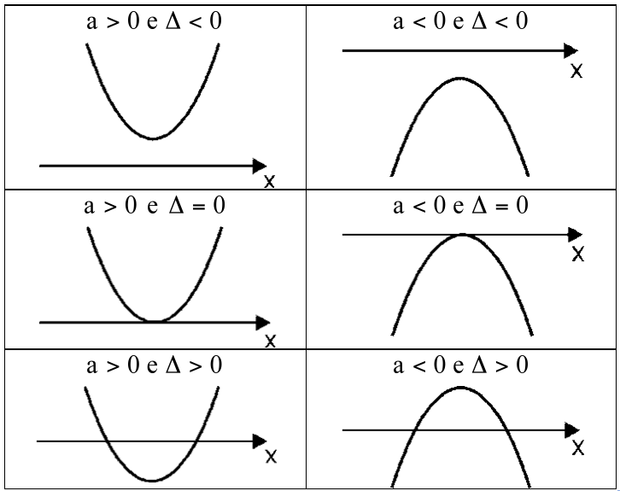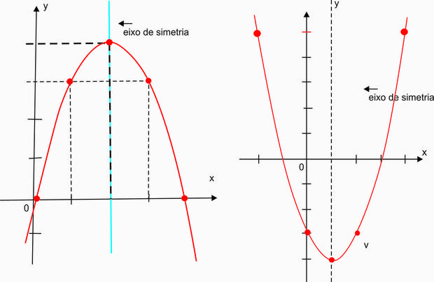 Observe que o eixo de simetria intercepta o eixo x (eixo das abscissas) num ponto equidistante das raízes, além de interceptar a parábola em seu ponto de máximo ou em seu ponto de mínimo.