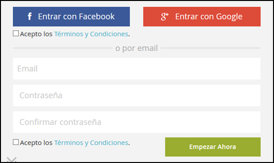 Podemos registrarnos también utilizando una cuenta de Facebook o Google.