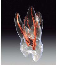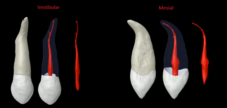 Raiz mesial: 2 conductos curvatura hacia distal. Raiz distal: un conducto, recto.