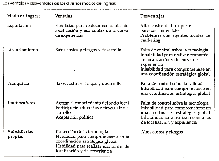 Desventajas: Falta de aceptación del medio local, inhabilidad para realizar economías de localización y