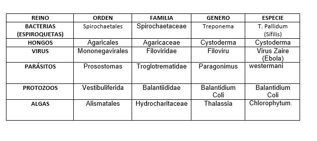 Reino, Filum, Orden, Clase, Familia, Genero y Especie