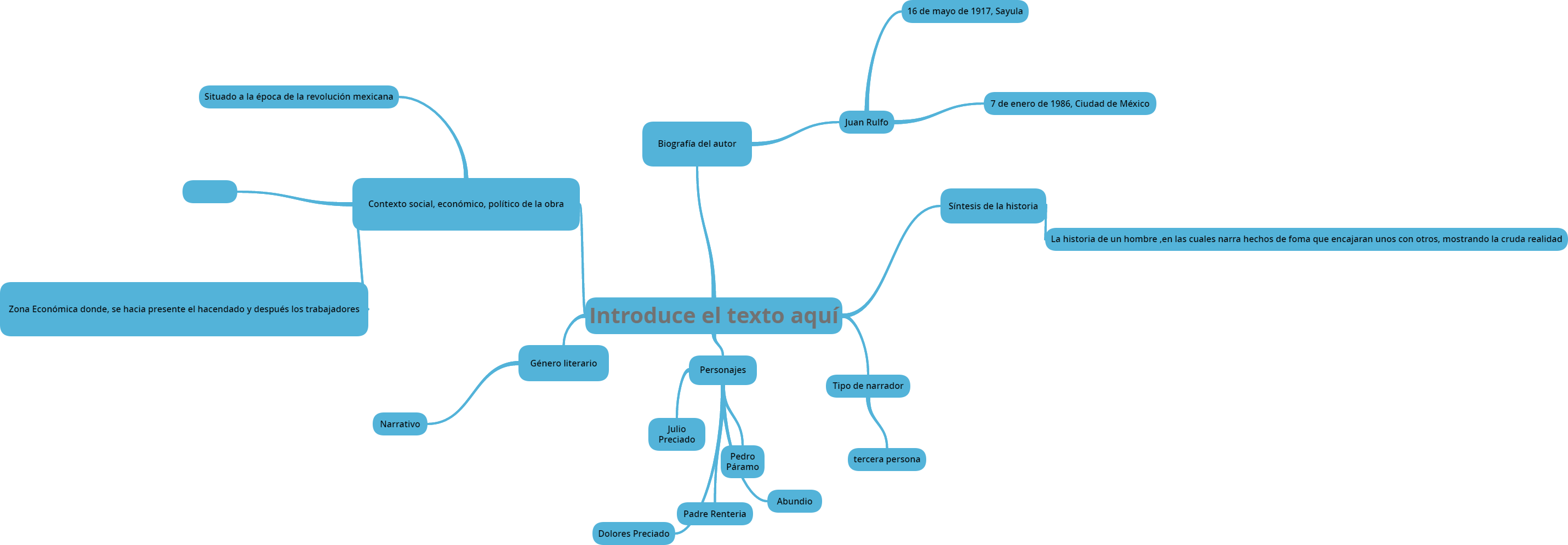 elaboarción de un mapa conceptual de Pedro páramo que contenga la siguiente información: 1. Biografía del autor, 2. Contexto social, económico, político de la obra 3. Género literario 4. Personajes 5. Tipo de narrador 6. Síntesis de la historia