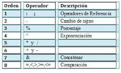 Concatenación (+) 6. Relaciónales (=, <, >) 7.