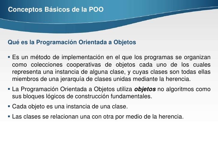1. es un paradigma de programación que viene a innovar la forma de obtener resultados. Los objetos manipulan los datos de entrada para la obtención de datos de salida específicos, donde cada objeto ofrece una funcionalidad especial. Muchos de los objetos pre-diseñados de los lenguajes de programación actuales permiten la agrupación en bibliotecas o librerías, sin embargo, muchos de estos lenguajes permiten al usuario la creación de sus propias bibliotecas. Está basada en varias técnicas, incluyendo herencia, cohesión, abstracción, polimorfismo, acoplamiento y encapsulamiento.