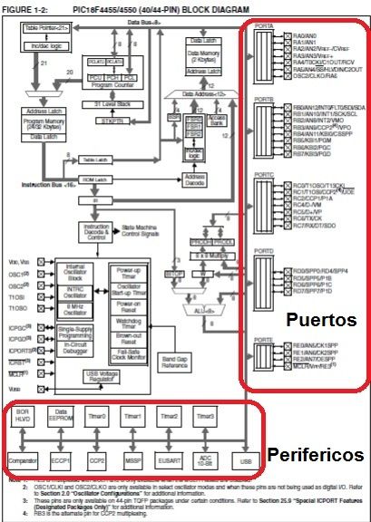 diagrama que muestra la arquitectura del microcontrolador destacando los puertos y los