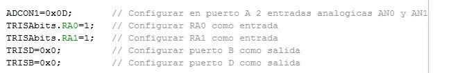 (TRISAbits.RA1=1; // Configurar RA1 como entrada); en la cuarta línea se configura el puerto D como