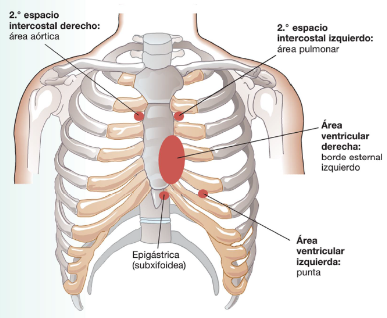 Palpar sobre los focos de auscultación: aórtico, pulmonar, tricuspídeo, mitral, foco accesorio, epigastrio.