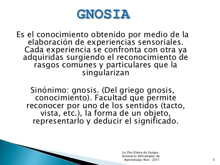 reconocimiento de los sonidos. Gnosias visuales: Reconocimiento de colores y formas. Presuponen la