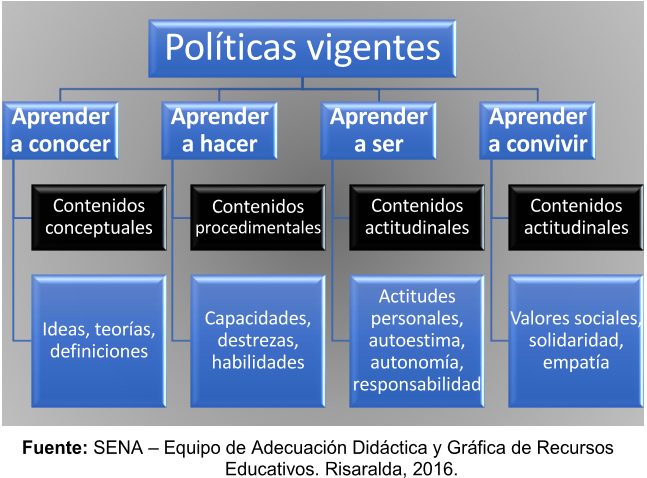 1. Como ya se estudió en la sección anterior existen muchos modelos pedagógicos a los cuales las instituciones educativas pueden acudir para orientar su formación. Esta decisión marca tanto a los miembros de dicha comunidad educativa, como a la forma cómo se llevan a cabo los procesos curriculares y evaluativos dentro de la institución, por tanto, cuando el maestro en formación ingresa a laborar en una institución educativa, debe saber de antemano el modelo que guía el tipo de formación que orientará en su diario quehacer. Así que a continuación podrá analizar el enfoque pedagógico SENA.