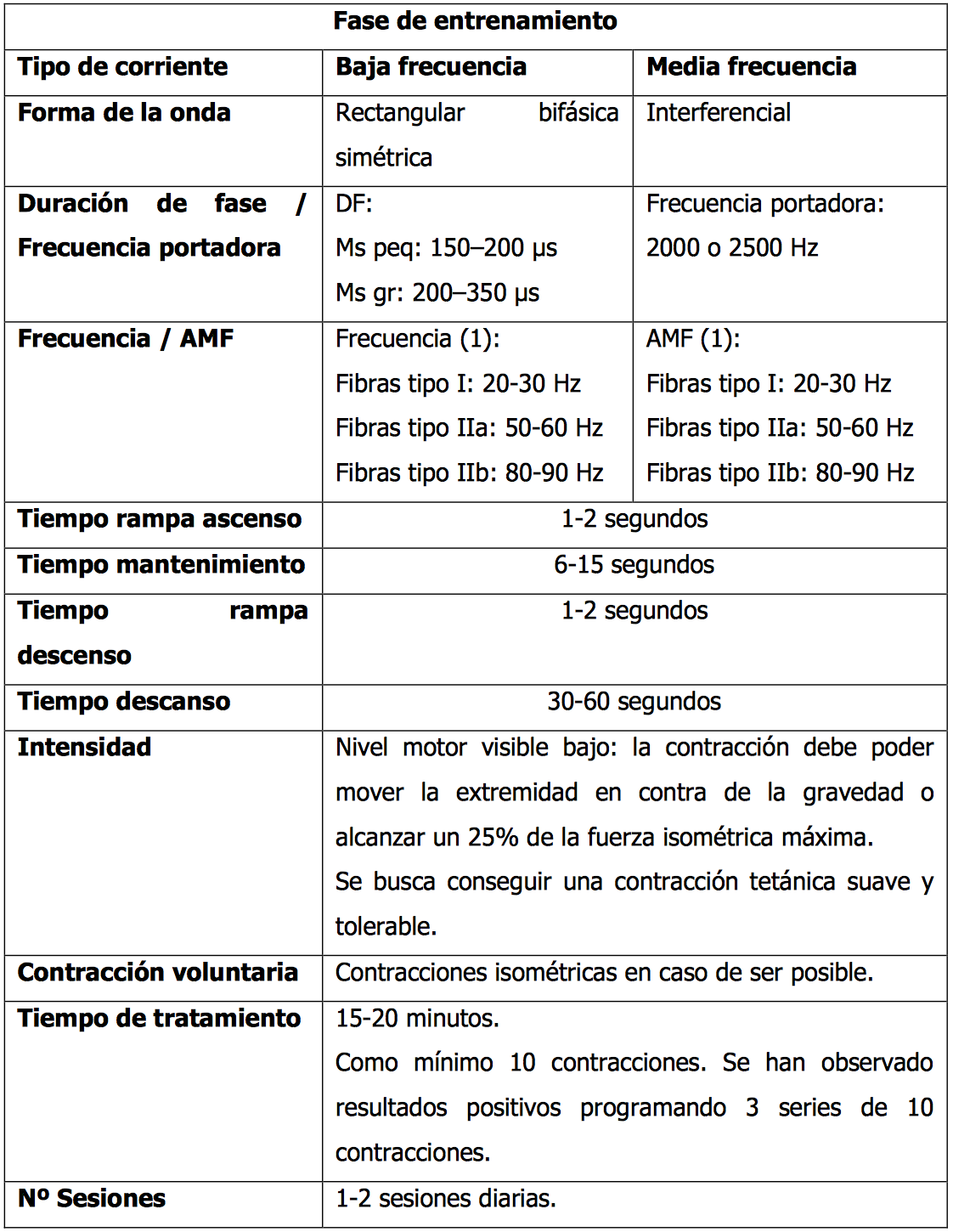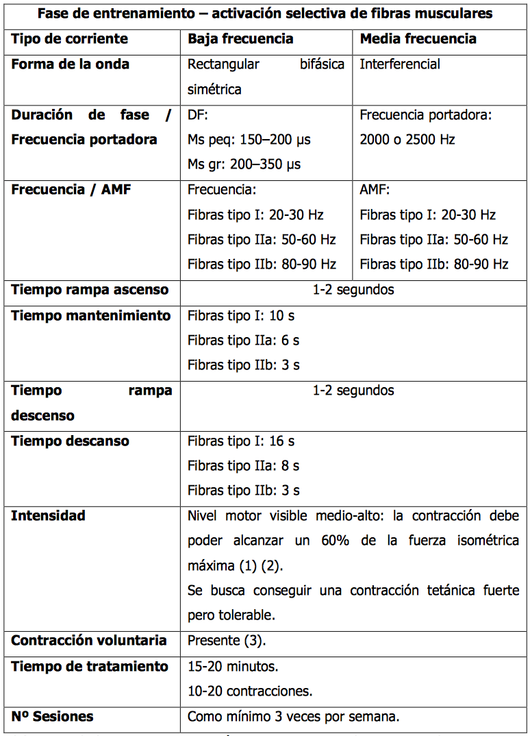 Activación de fibras tipo I: 20-30 Hz. Activación de fibras tipo IIa: 50-60 Hz. Activación de fibras tipo IIb: 80-90 Hz.