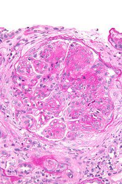 confiere un aspecto lobulado al glomérulo. La interposición de matriz mesangial entre las células